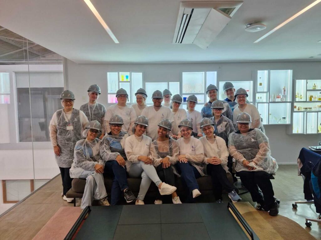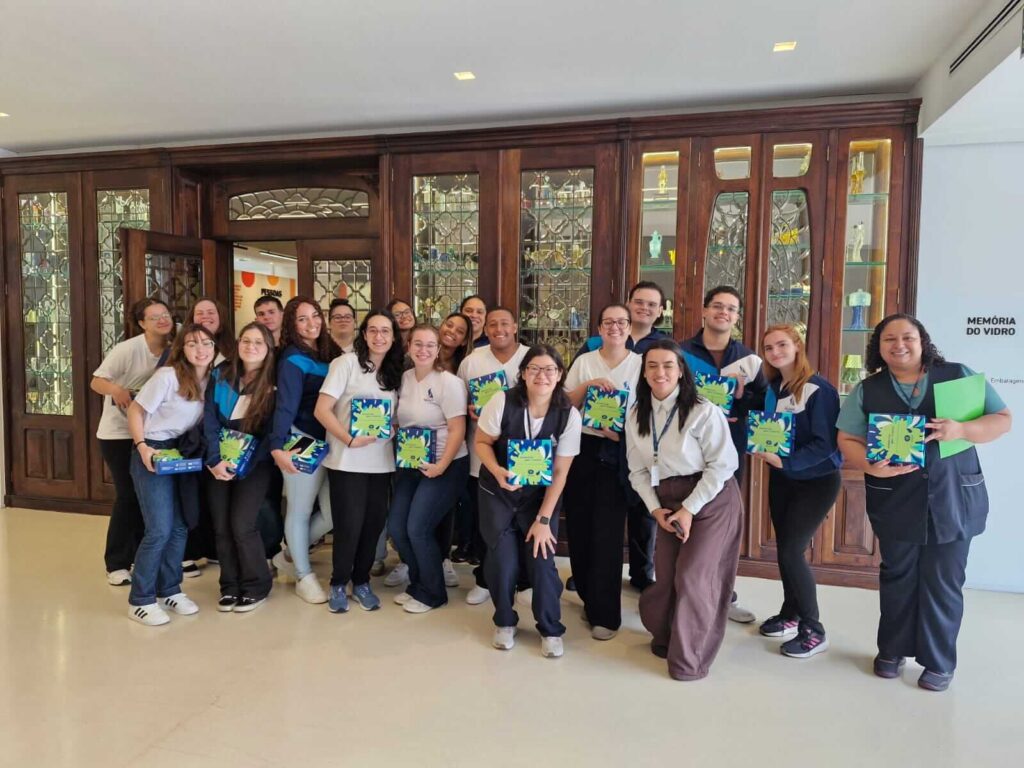 A programação incluiu palestras sobre a empresa, seus produtos e a fabricação de diferentes tipos de vidro — flint (transparente), âmbar e colorido. Na planta industrial, os estudantes acompanharam etapas como a produção da massa vítrea, a formação da gota de vidro, a modelagem dos frascos, o controle de qualidade e o empacotamento.
